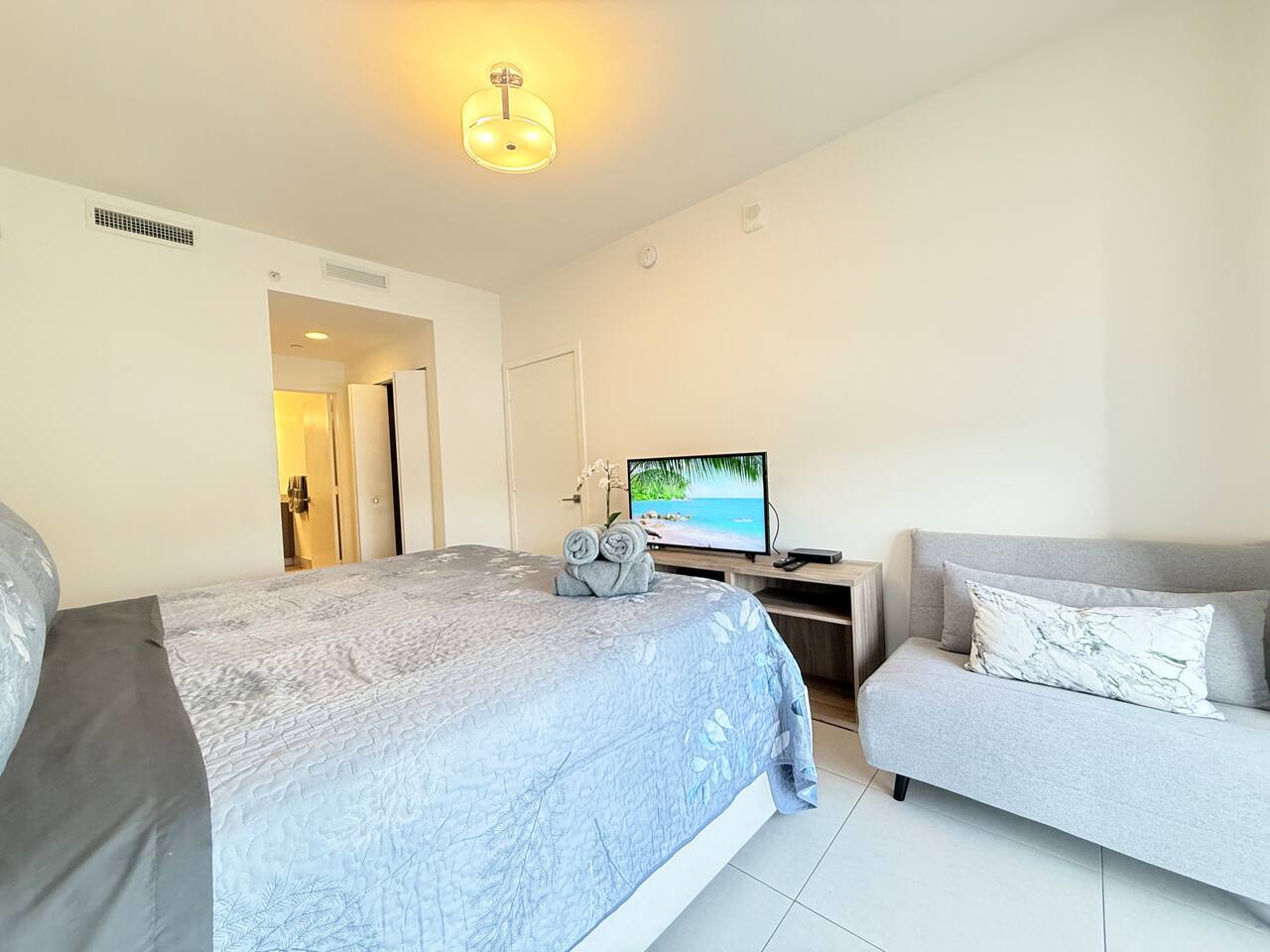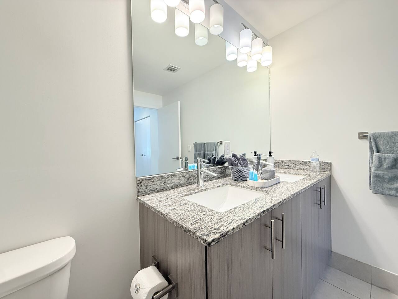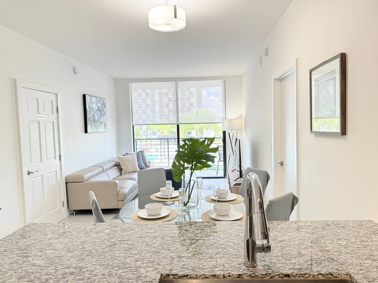 ROOMS: This apartment sleeps 5 guests. Please see below for bed count: - Room 1: King bed with a smart TV and private bathroom attached. (Sleeps 2) - Room 2: King bed, Small Twin Couch Sleeper with a smart TV and private bathroom attached. (sleeps 3) BATHROOMS: 2 full bathrooms fully stocked with shampoo, conditioner, body wash, hand soap, wash cloths, towels, and a hair dryer. KITCHEN AND DINING: Fully stocked with pots & pans, plates, cups, mugs, utensils, cooking tools, coffee pot, toaster oven, oven, refrigerator, and microwave. The dining area has a table and a bar spaced with seating for 4, with all the necessary dinnerware. OUTDOOR SPACE: There is a spacious balcony area overlooking the city of Doral with lounge furniture to enjoy the South Florida weather. PARKING: Free parking is available in the building's car garage for 1 car. If you will be bringing an additional vehicle, there is paid street parking available in front of the building. WHAT'S INCLUDED: Free wifi, We provide a starter pack of essentials (toilet paper, paper towels, & toiletry) for your first few nights. You may need to purchase more depending on use. MAIL POLICY: We are unable to accept mail or packages at this unit as we do not have access to the mailbox. Please refrain from having mail delivered to this address. Instead, consider using a P.O. Box or an Amazon Locker for your deliveries! DRIVING DISTANCES: Miami International Airport: 20 mins Miami beach: 25 Mins Downtown Miami: 25 Mins Wynwood: 25 Mins Downtown Doral: 2 Mins Doral City Place: 5 mins Dolphin Mall: 10 mins International Mall: 8 mins Dadeland Mall: 15 mins