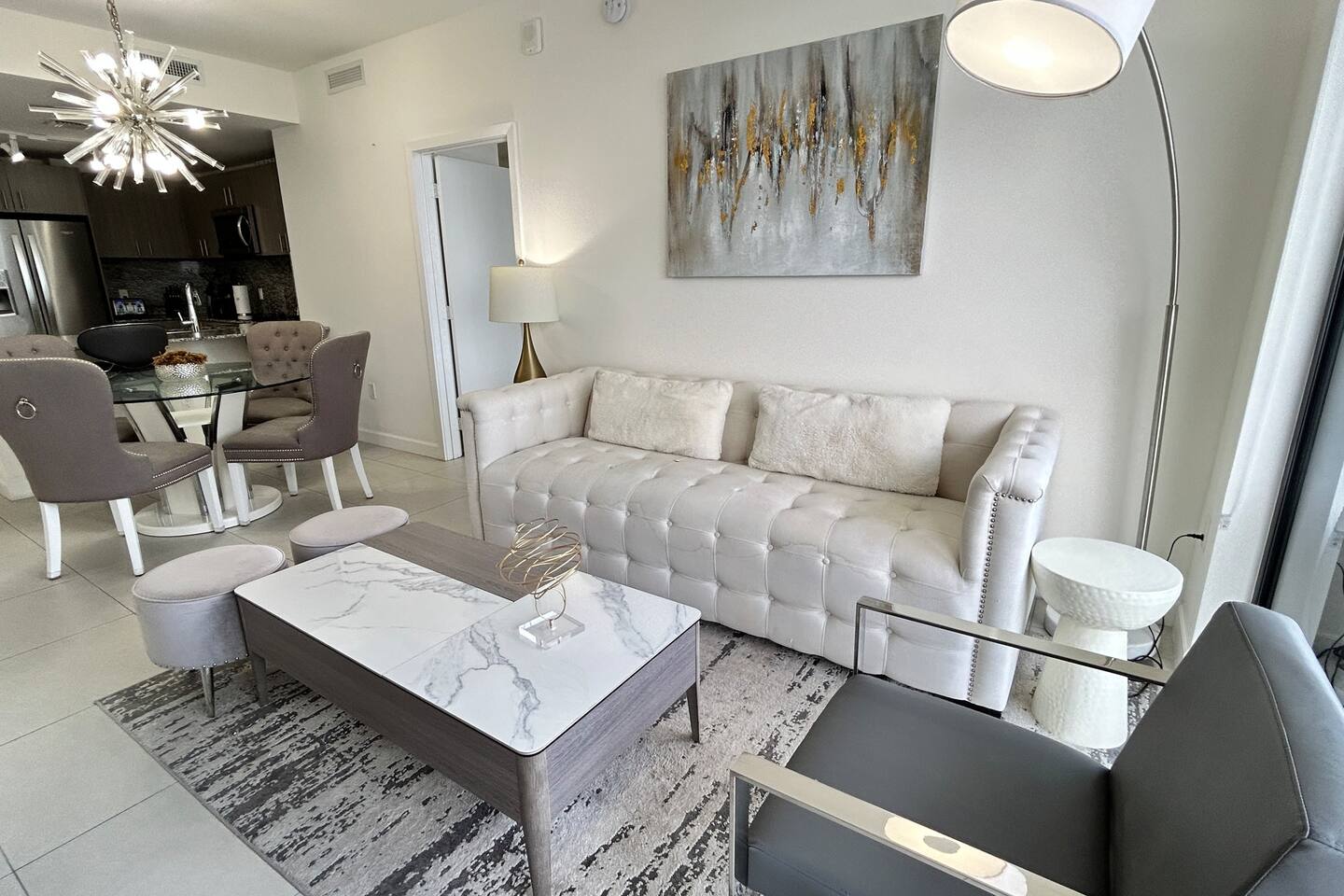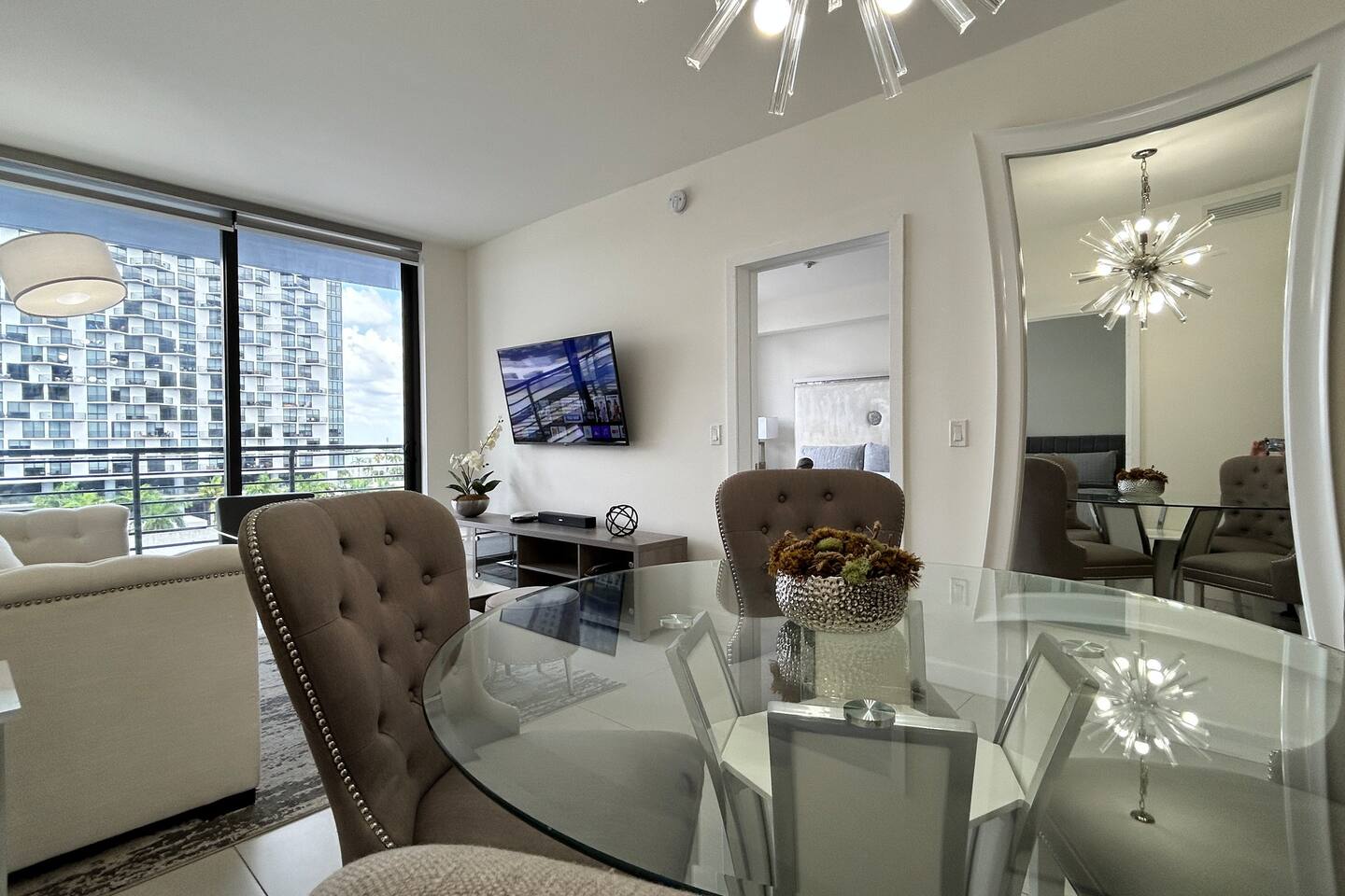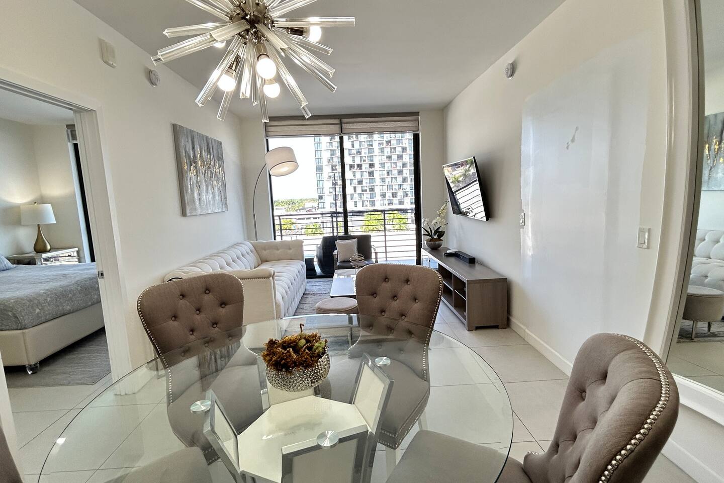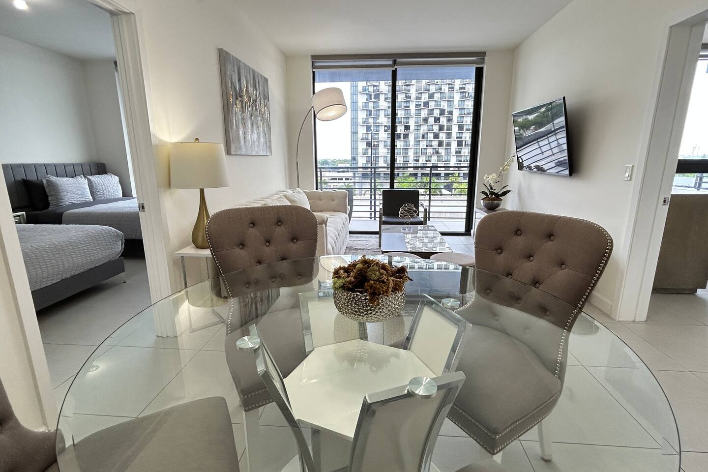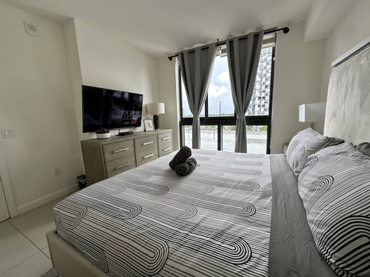 ROOMS: This apartment sleeps 6 guests. Please see below for bed count: - Room 1: King bed with a smart TV and private bathroom attached. (Sleeps 2) - Room 2: Two Queen beds with a smart TV and private bathroom attached. (sleeps 4) BATHROOMS: 2 full bathrooms fully stocked with shampoo, conditioner, body wash, hand soap, wash cloths, towels, and a hair dryer. KITCHEN AND DINING: Fully stocked with pots & pans, plates, cups, mugs, utensils, cooking tools, coffee pot, toaster, oven, refrigerator, and microwave. The dining area has a table and a bar spaced with seating for 6, with all the necessary dinnerware. OUTDOOR SPACE: There is a spacious balcony area overlooking the city of Doral with lounge furniture to enjoy the South Florida weather. PARKING: Free parking is available in the building's car garage for 1 car. If you will be bringing an additional vehicle, there is paid street parking available in front of the building. WHAT'S INCLUDED: Free wifi, We provide a starter pack of essentials (toilet paper, paper towels, & toiletry) for your first few nights. You may need to purchase more depending on use. MAIL POLICY: We are unable to accept mail or packages at this unit as we do not have access to the mailbox. Please refrain from having mail delivered to this address. Instead, consider using a P.O. Box or an Amazon Locker for your deliveries! DRIVING DISTANCES: Miami International Airport: 20 mins Miami beach: 25 Mins Downtown Miami: 25 Mins Wynwood: 25 Mins Downtown Doral: 2 Mins Doral City Place: 5 mins Dolphin Mall: 10 mins International Mall: 8 mins Dadeland Mall: 15 mins