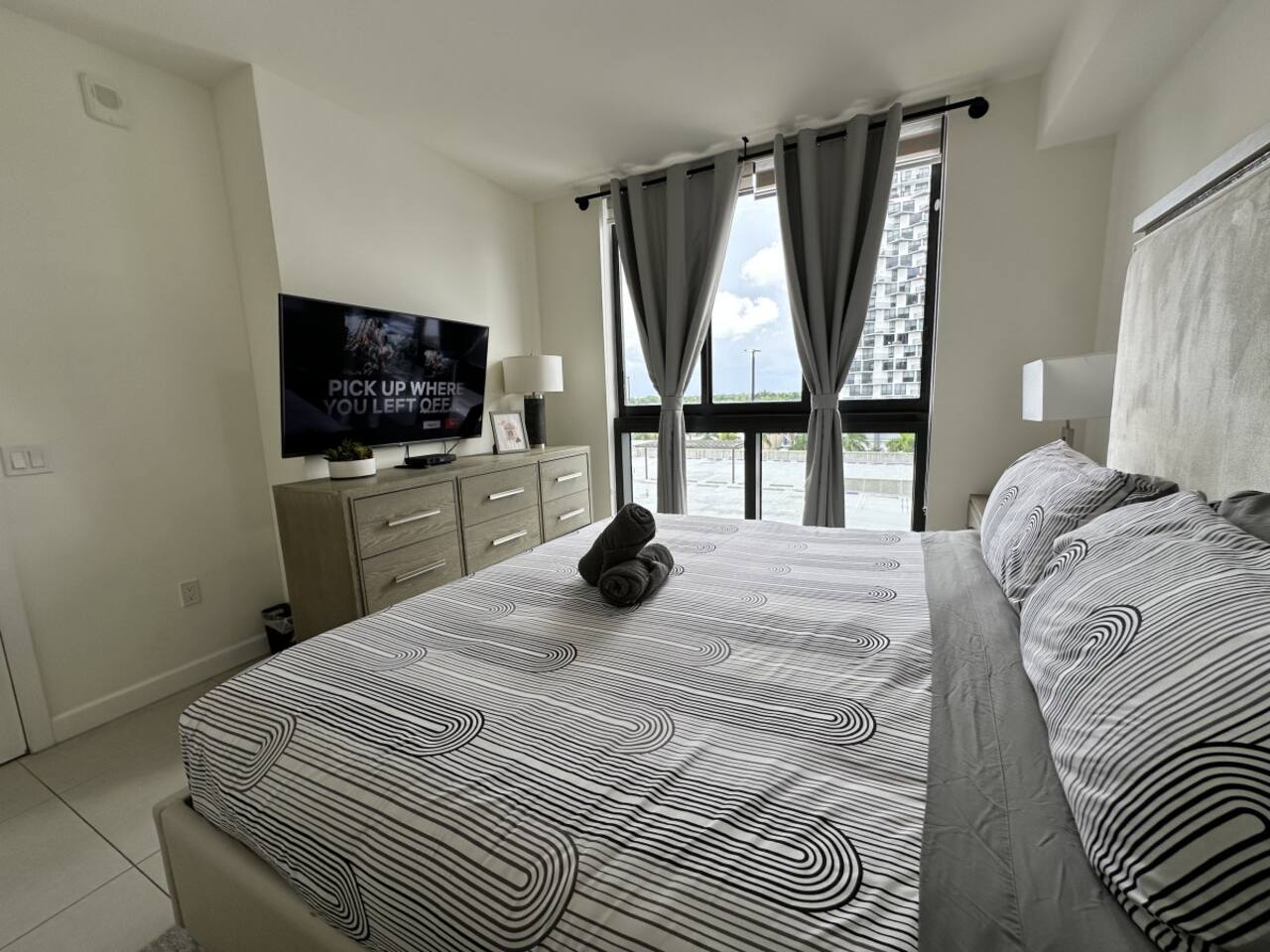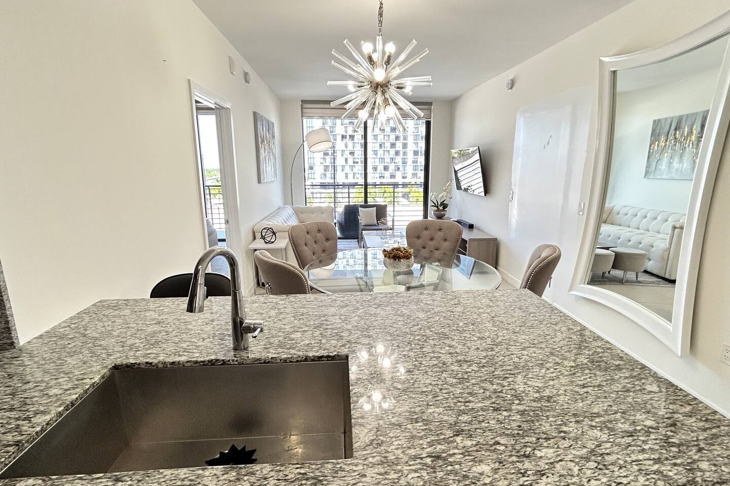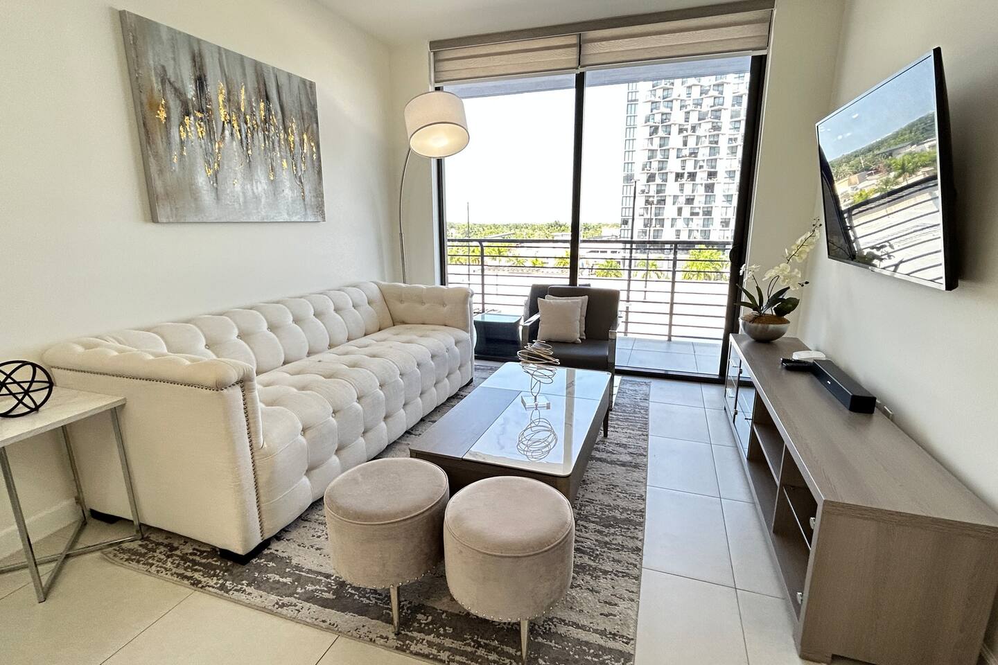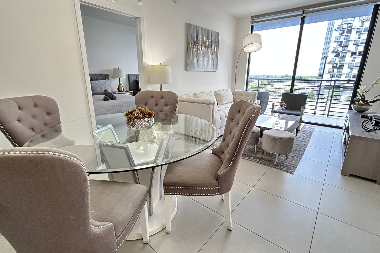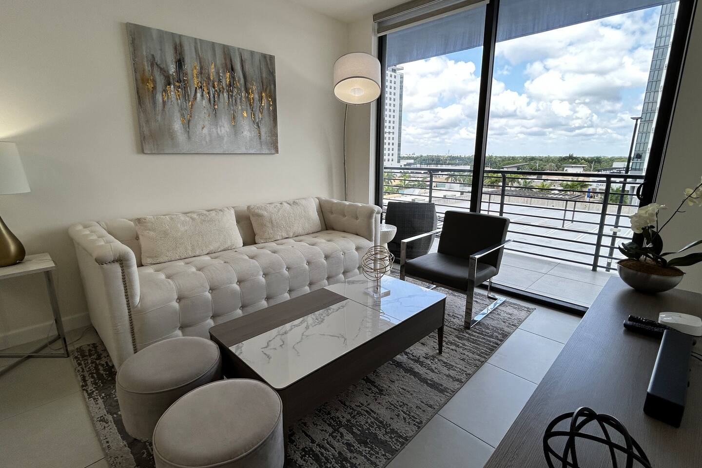 ROOMS: This apartment sleeps 6 guests. Please see below for bed count: - Room 1: King bed with a smart TV and private bathroom attached. (Sleeps 2) - Room 2: Two Queen beds with a smart TV and private bathroom attached. (sleeps 4) BATHROOMS: 2 full bathrooms fully stocked with shampoo, conditioner, body wash, hand soap, wash cloths, towels, and a hair dryer. KITCHEN AND DINING: Fully stocked with pots & pans, plates, cups, mugs, utensils, cooking tools, coffee pot, toaster, oven, refrigerator, and microwave. The dining area has a table and a bar spaced with seating for 6, with all the necessary dinnerware. OUTDOOR SPACE: There is a spacious balcony area overlooking the city of Doral with lounge furniture to enjoy the South Florida weather. PARKING: Free parking is available in the building's car garage for 1 car. If you will be bringing an additional vehicle, there is paid street parking available in front of the building. WHAT'S INCLUDED: Free wifi, We provide a starter pack of essentials (toilet paper, paper towels, & toiletry) for your first few nights. You may need to purchase more depending on use. MAIL POLICY: We are unable to accept mail or packages at this unit as we do not have access to the mailbox. Please refrain from having mail delivered to this address. Instead, consider using a P.O. Box or an Amazon Locker for your deliveries! DRIVING DISTANCES: Miami International Airport: 20 mins Miami beach: 25 Mins Downtown Miami: 25 Mins Wynwood: 25 Mins Downtown Doral: 2 Mins Doral City Place: 5 mins Dolphin Mall: 10 mins International Mall: 8 mins Dadeland Mall: 15 mins