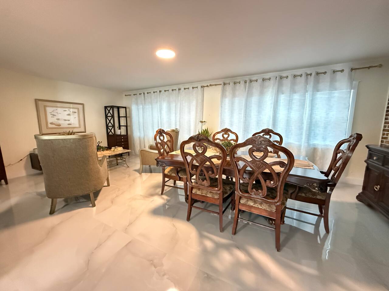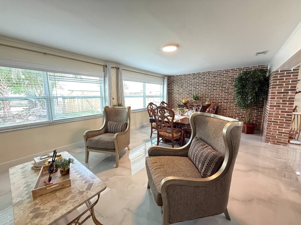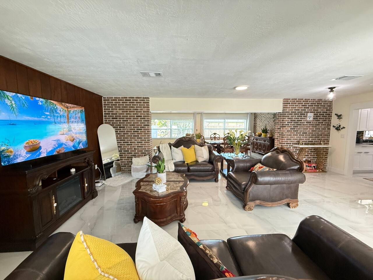 Forget your worries in this spacious and serene space. This is a big house. With a nice kitchen two dining room three bathroom two bathroom living room TV there is another area to read or space nice area outside .