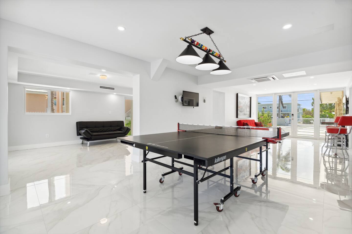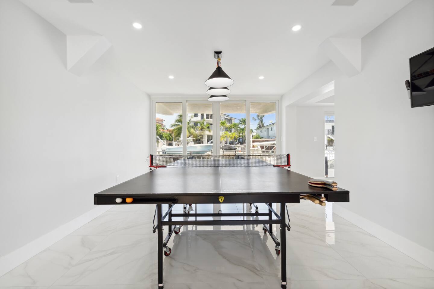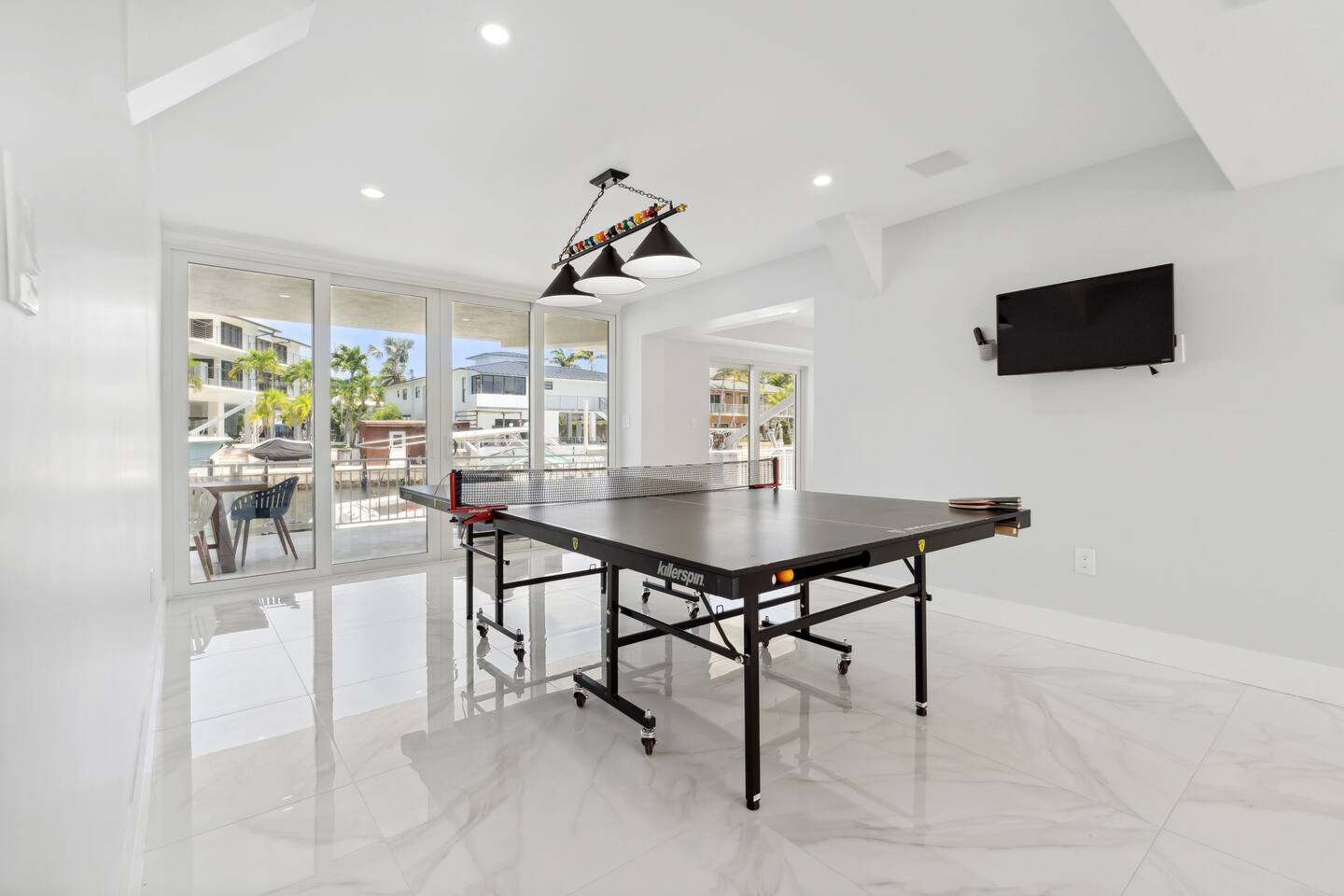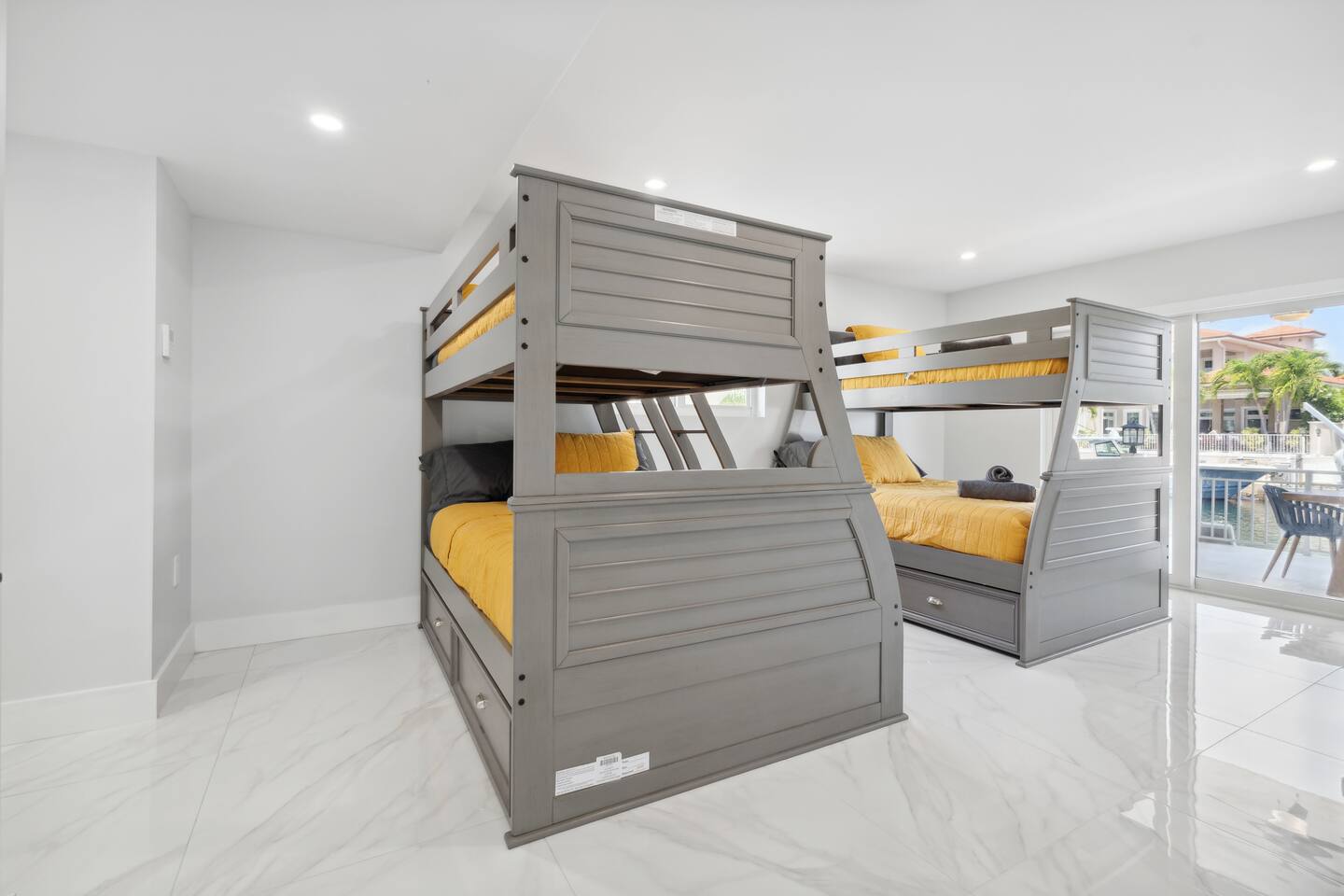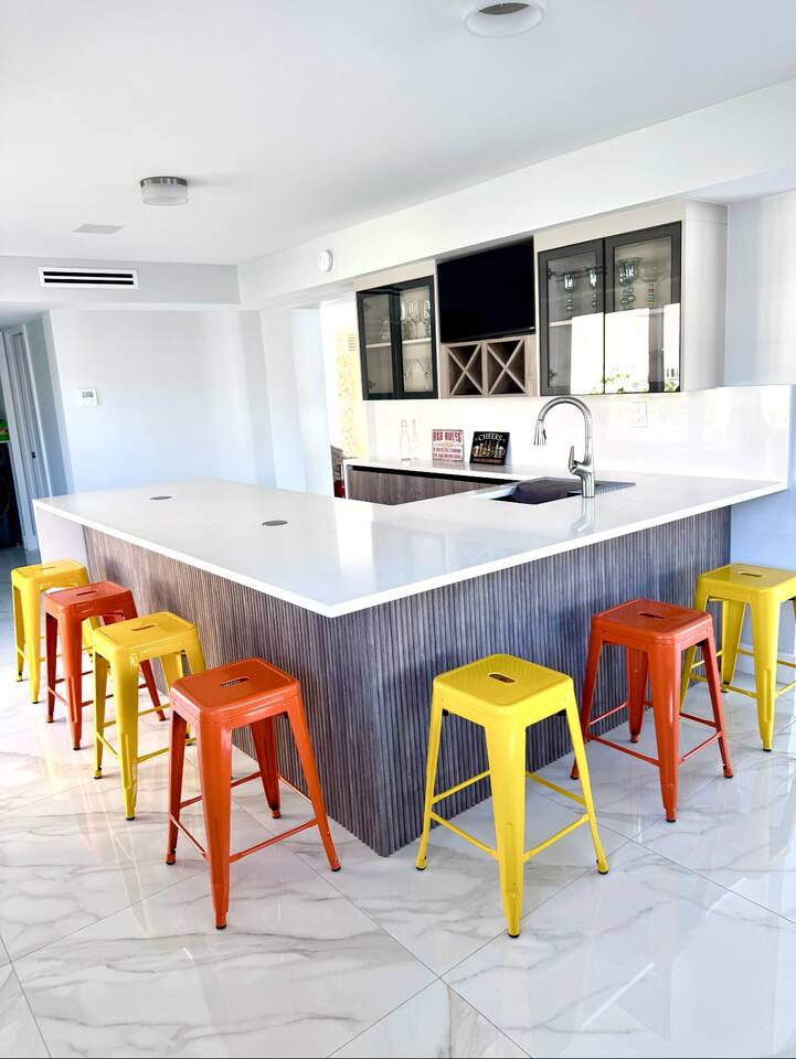 Spread across three stories, this home offers ample space for relaxation and entertainment. Marvel at the sleek marble floors and modern design that runs throughout, creating an atmosphere of sophistication. FIRST FLOOR Bedroom 1: Two bunk beds with a full mattress and a twin on the top with a private bathroom attached (sleeps 6) LIVING ROOM/ GAME ROOM Couch with Smart TV Ping Pong Table SECOND FLOOR Bedroom 2: Queen bed with a private bathroom attached (sleeps 2) Bedroom 3: Two full sized beds with a private bathroom attached (sleeps 4) LIVING ROOM Sectional Couch with Smart TV KITCHEN Open concept kitchen with counter seating and a dining table BALCONY Wrap around balcony for unbelievable views and plenty of seating and loungers for total relaxation. THIRD FLOOR Bedroom 4: King sized bed with a private wrap around porch and private luxury spa master bath (sleeps 2) Parking and Dock: Park up to 8 cars with ease, ensuring that everyone in your group has convenient access. If you're arriving by boat, take advantage of the private dock with a dedicated spot for your watercraft or a boat. Must inform us beforehand. Outdoor Bliss: Lounge by the small private swimming pool or enjoy a meal on the outdoor furniture, surrounded by lush greenery. The wrap-around balcony on the second and third floors offers panoramic views, creating the perfect backdrop for your morning coffee or evening cocktails. Gourmet Kitchen: The heart of the home, our open-concept kitchen is fully equipped with modern appliances and updated hardware. Prepare delicious meals with ease, and gather around the spacious dining area for memorable dinners. WHATS INCLUDED: Free Wi-Fi, We provide a starter pack of essentials (toilet paper, paper towels, & toiletry) for your first few nights. You may need to purchase more depending on use