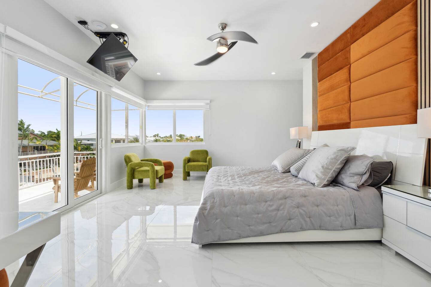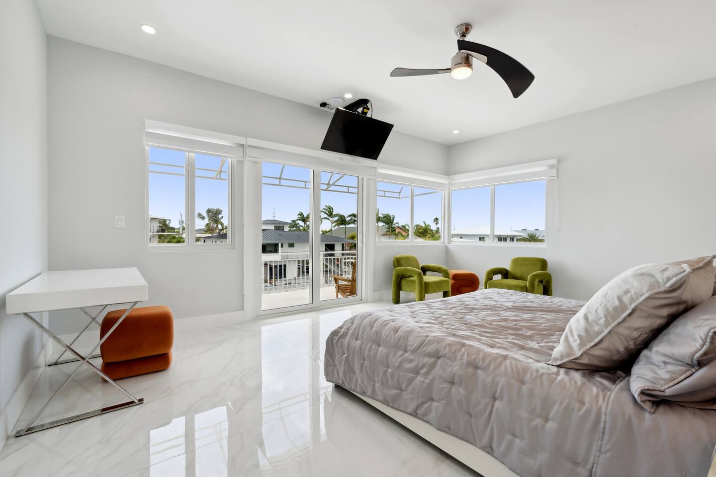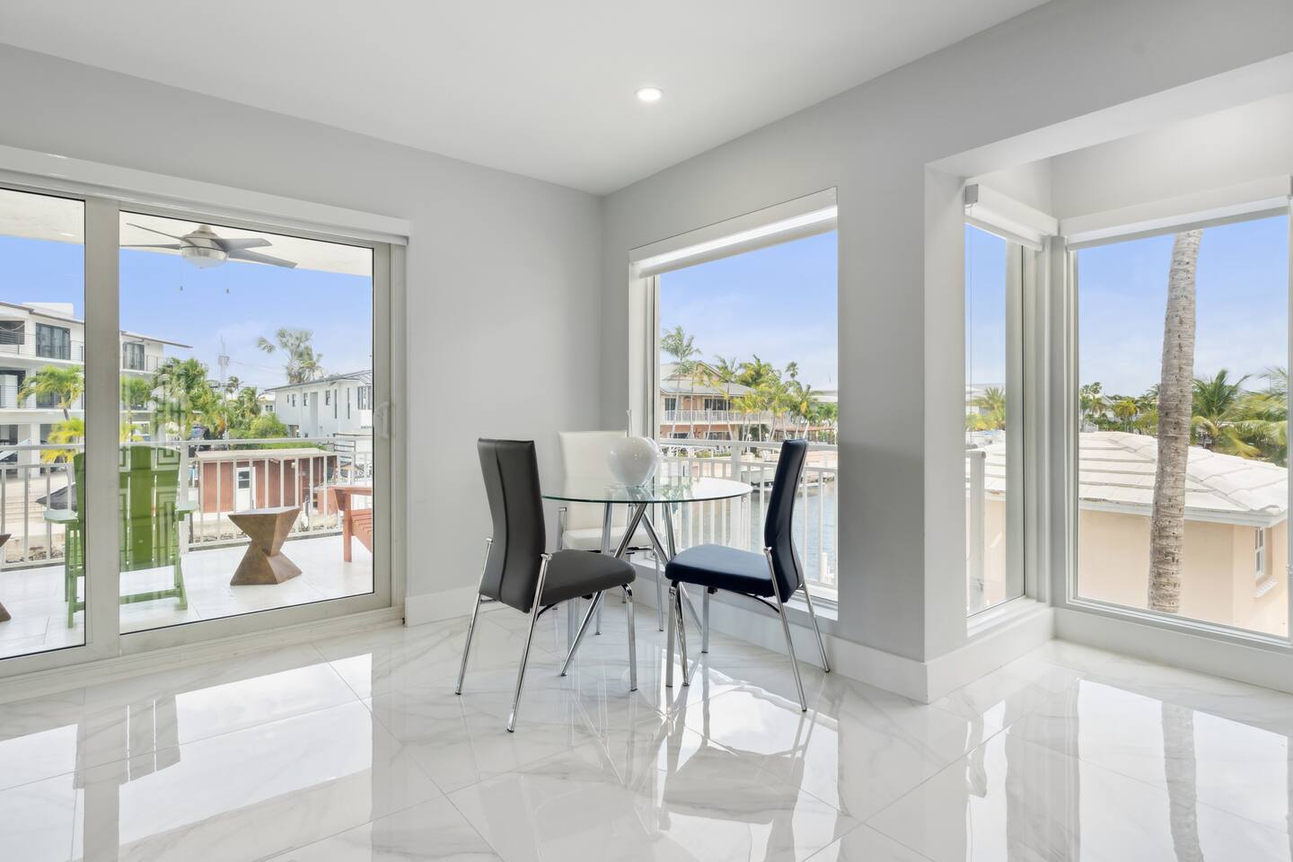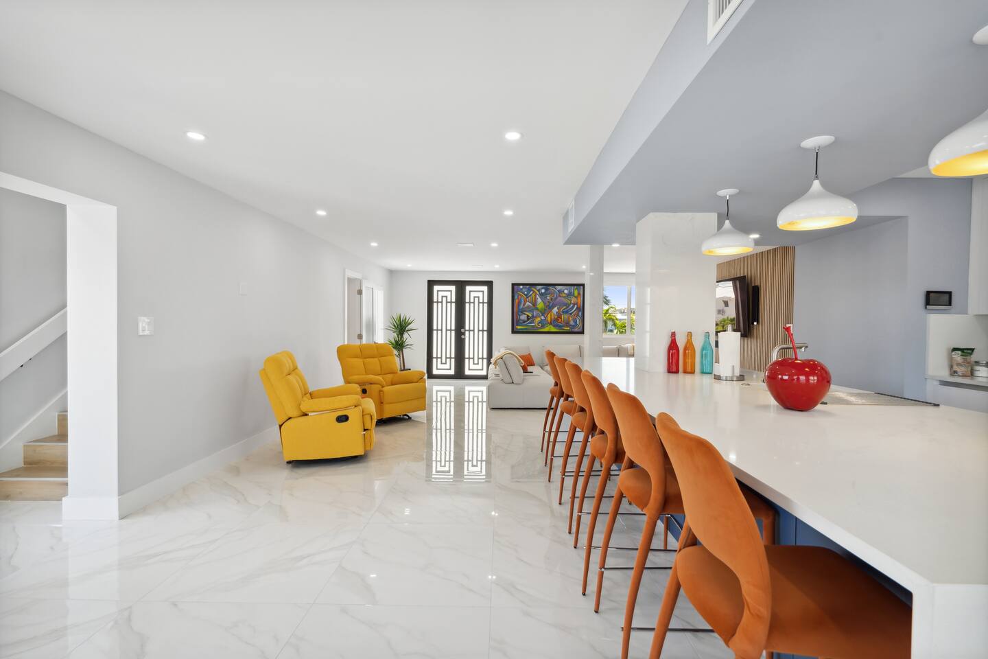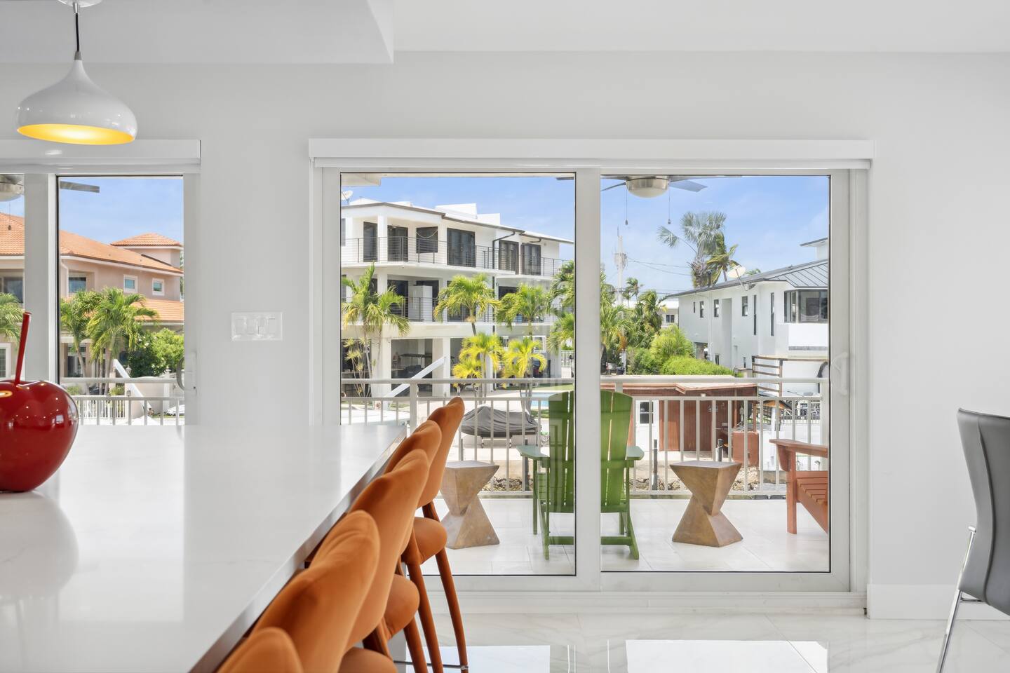Spread across three stories, this home offers ample space for relaxation and entertainment. Marvel at the sleek marble floors and modern design that runs throughout, creating an atmosphere of sophistication. FIRST FLOOR Bedroom 1: Two bunk beds with a full mattress and a twin on the top with a private bathroom attached (sleeps 6) LIVING ROOM/ GAME ROOM Couch with Smart TV Ping Pong Table SECOND FLOOR Bedroom 2: Queen bed with a private bathroom attached (sleeps 2) Bedroom 3: Two full sized beds with a private bathroom attached (sleeps 4) LIVING ROOM Sectional Couch with Smart TV KITCHEN Open concept kitchen with counter seating and a dining table BALCONY Wrap around balcony for unbelievable views and plenty of seating and loungers for total relaxation. THIRD FLOOR Bedroom 4: King sized bed with a private wrap around porch and private luxury spa master bath (sleeps 2) Parking and Dock: Park up to 8 cars with ease, ensuring that everyone in your group has convenient access. If you're arriving by boat, take advantage of the private dock with a dedicated spot for your watercraft or a boat. Must inform us beforehand. Outdoor Bliss: Lounge by the small private swimming pool or enjoy a meal on the outdoor furniture, surrounded by lush greenery. The wrap-around balcony on the second and third floors offers panoramic views, creating the perfect backdrop for your morning coffee or evening cocktails. Gourmet Kitchen: The heart of the home, our open-concept kitchen is fully equipped with modern appliances and updated hardware. Prepare delicious meals with ease, and gather around the spacious dining area for memorable dinners. WHATS INCLUDED: Free Wi-Fi, We provide a starter pack of essentials (toilet paper, paper towels, & toiletry) for your first few nights. You may need to purchase more depending on use