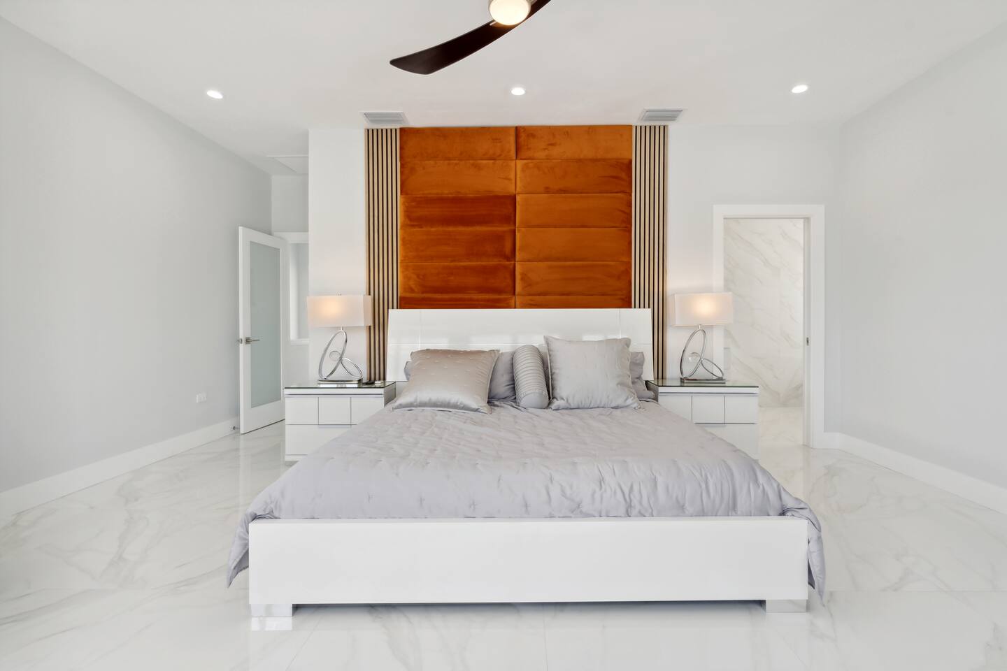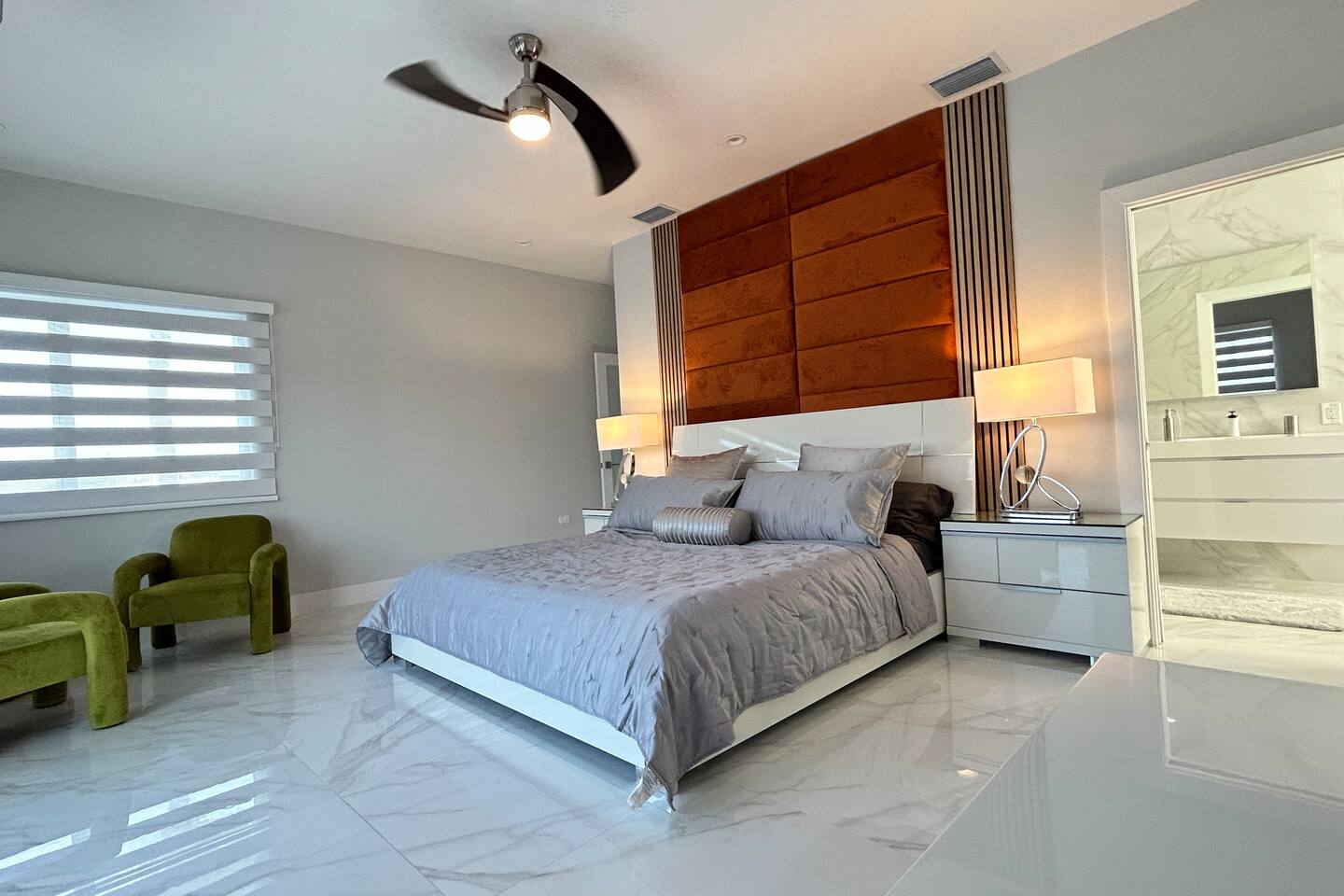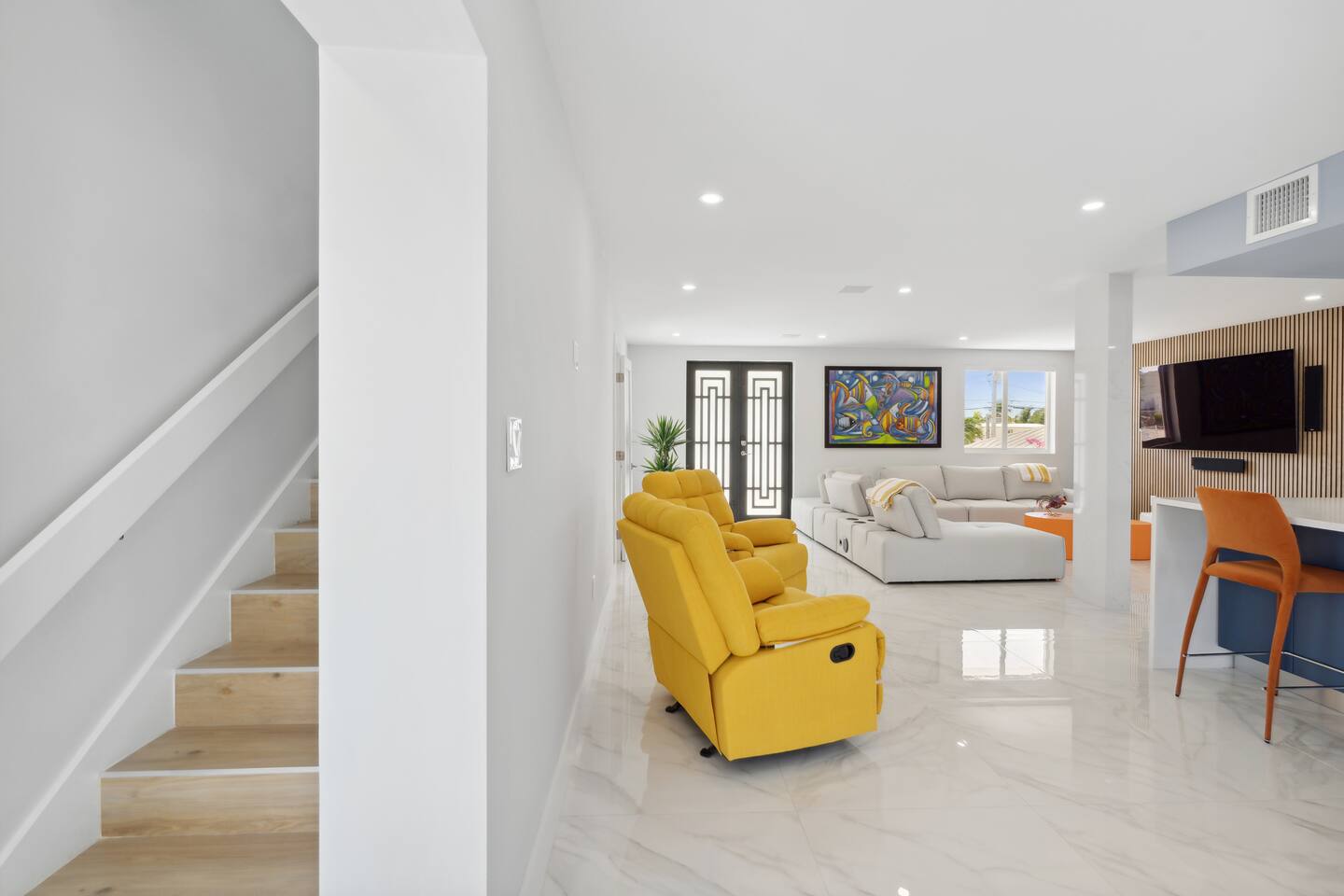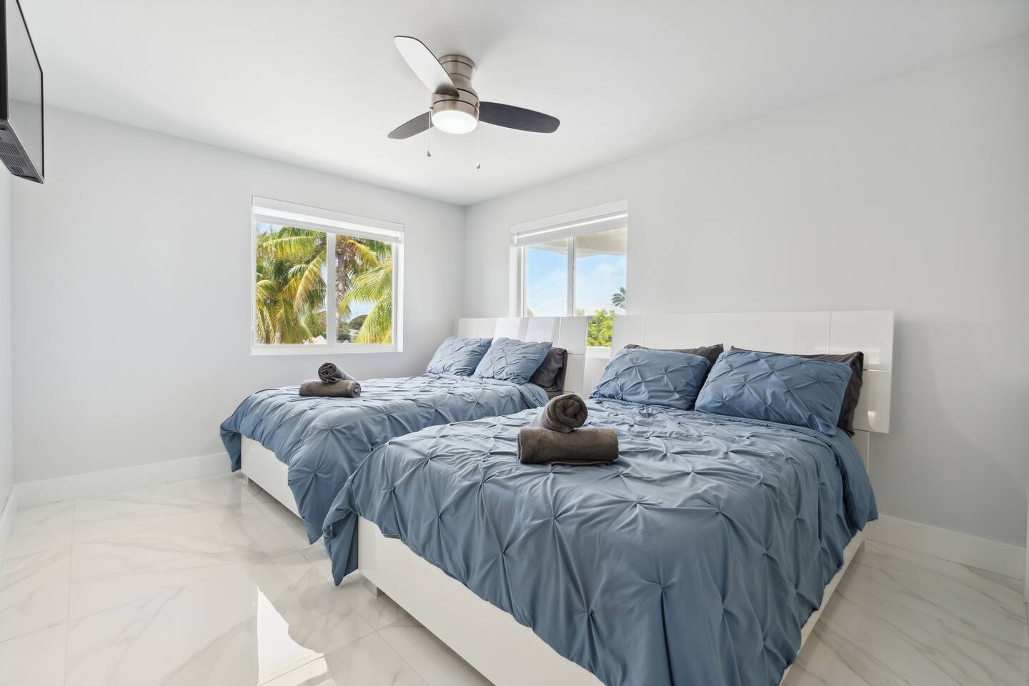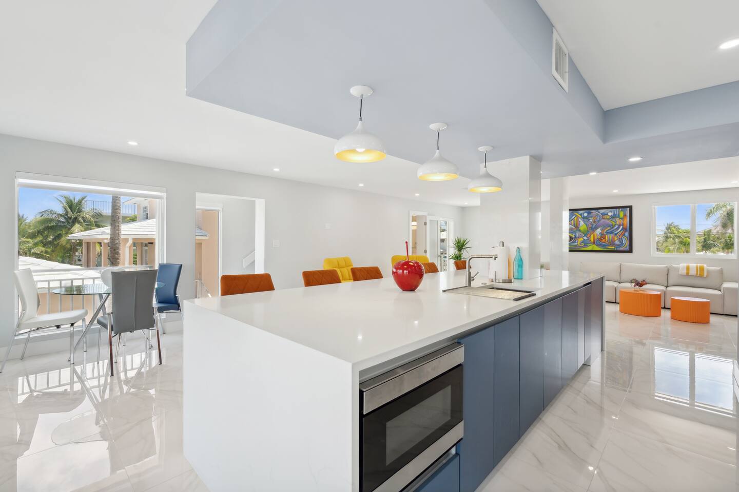 Spread across three stories, this home offers ample space for relaxation and entertainment. Marvel at the sleek marble floors and modern design that runs throughout, creating an atmosphere of sophistication. FIRST FLOOR Bedroom 1: Two bunk beds with a full mattress and a twin on the top with a private bathroom attached (sleeps 6) LIVING ROOM/ GAME ROOM Couch with Smart TV Ping Pong Table SECOND FLOOR Bedroom 2: Queen bed with a private bathroom attached (sleeps 2) Bedroom 3: Two full sized beds with a private bathroom attached (sleeps 4) LIVING ROOM Sectional Couch with Smart TV KITCHEN Open concept kitchen with counter seating and a dining table BALCONY Wrap around balcony for unbelievable views and plenty of seating and loungers for total relaxation. THIRD FLOOR Bedroom 4: King sized bed with a private wrap around porch and private luxury spa master bath (sleeps 2) Parking and Dock: Park up to 8 cars with ease, ensuring that everyone in your group has convenient access. If you're arriving by boat, take advantage of the private dock with a dedicated spot for your watercraft or a boat. Must inform us beforehand. Outdoor Bliss: Lounge by the small private swimming pool or enjoy a meal on the outdoor furniture, surrounded by lush greenery. The wrap-around balcony on the second and third floors offers panoramic views, creating the perfect backdrop for your morning coffee or evening cocktails. Gourmet Kitchen: The heart of the home, our open-concept kitchen is fully equipped with modern appliances and updated hardware. Prepare delicious meals with ease, and gather around the spacious dining area for memorable dinners. WHATS INCLUDED: Free Wi-Fi, We provide a starter pack of essentials (toilet paper, paper towels, & toiletry) for your first few nights. You may need to purchase more depending on use