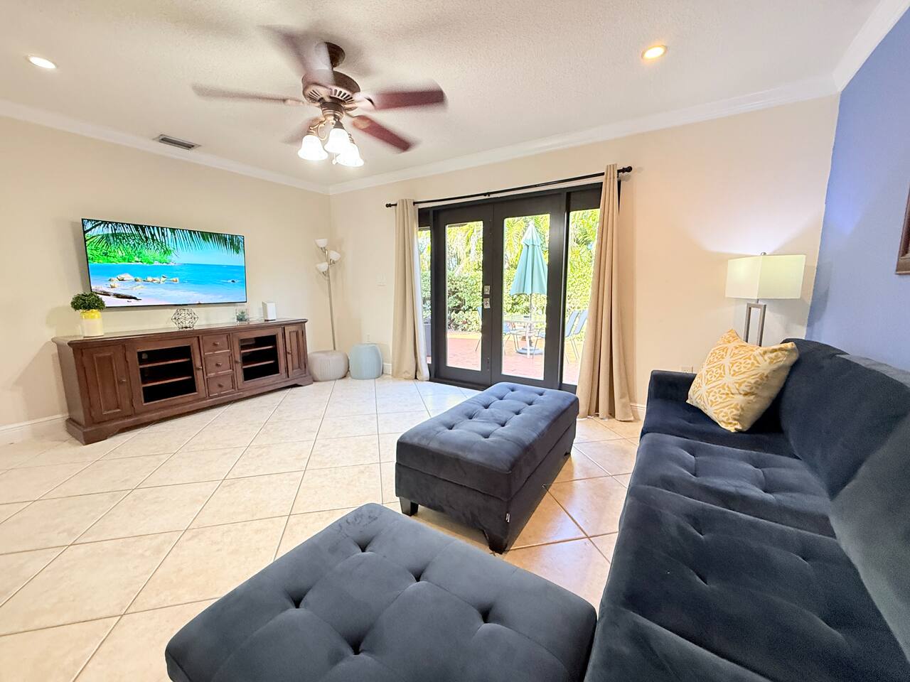 Spacious 3-Bedroom Home with Pool & Tennis Courts in Miami. Relax in this 3-bedroom, 2-bath home that sleeps 9 guests. Features include a private backyard, community pool, and tennis center with rackets and towels. Each room has a smart TV, and parking for 4 cars is available. Close to malls, beaches, and attractions . 🛏️ 3 Bedrooms | 🛁 2 Bathrooms 🏊♀️ Pool & Tennis Center 🚗 Free Parking for 4 cars | 📺 Smart TVs 📍 20 mins to Dolphin Mall & Miami International Airport.